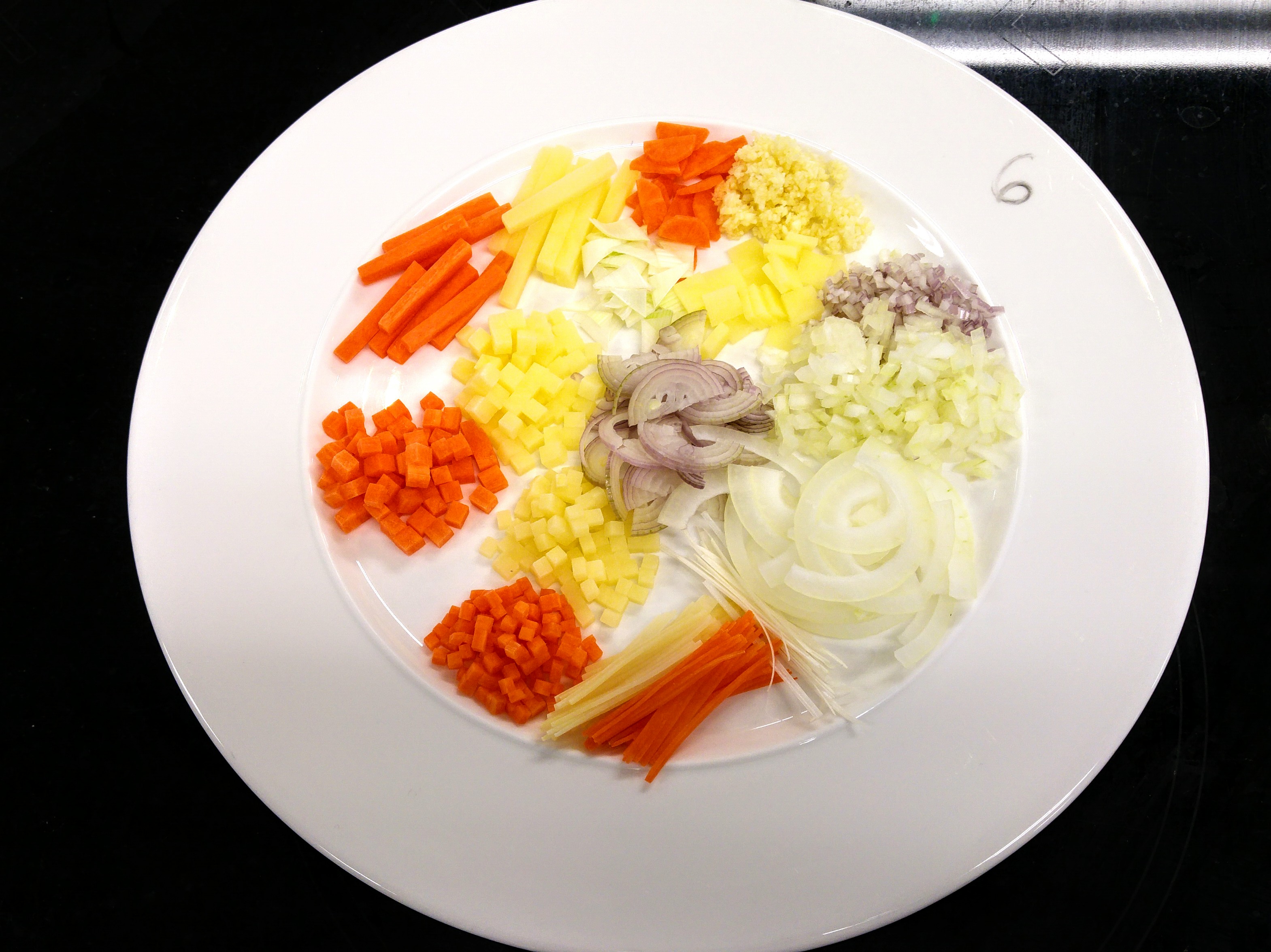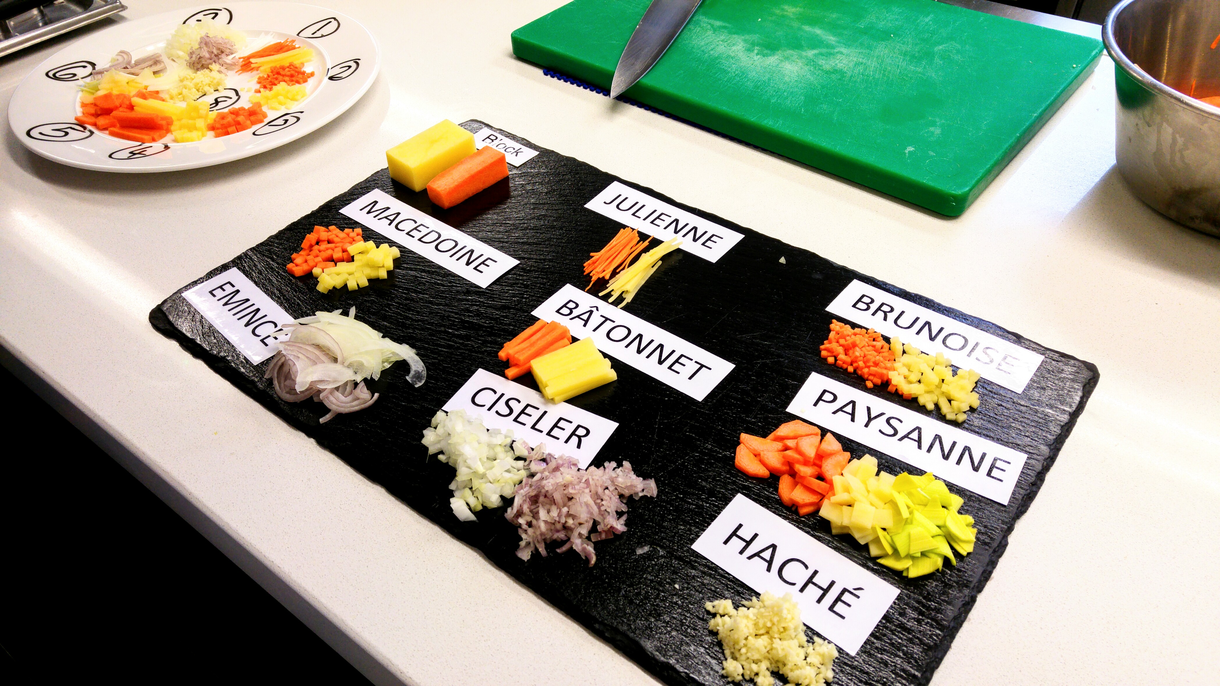 V demu nám chef ukázal obsah našich brašen s noži. A že jsou to nože! Krásné a opravdu ostré. Jak jsem zjistila později v praktickém, krájí se s nimi opravdu jedna báseň. Dále nám chef ukázal základní způsoby krájení zeleniny. Julienne (nudličky 5cm dlouhé, 1mmx1mm), brunoise (kostičky 3mmx3mm), macedoine (kostičky 5mmx5mm), batonnet (nudličky 4cm dlouhé, 5mmx5mm), paysane (přirozenější tvary, cca 1cmx1cmx2-3mm), emince (jemné proužky), ciseler (jemné nasekání) a haché (jemné nepravidelné nasekání bylinek či česneku).