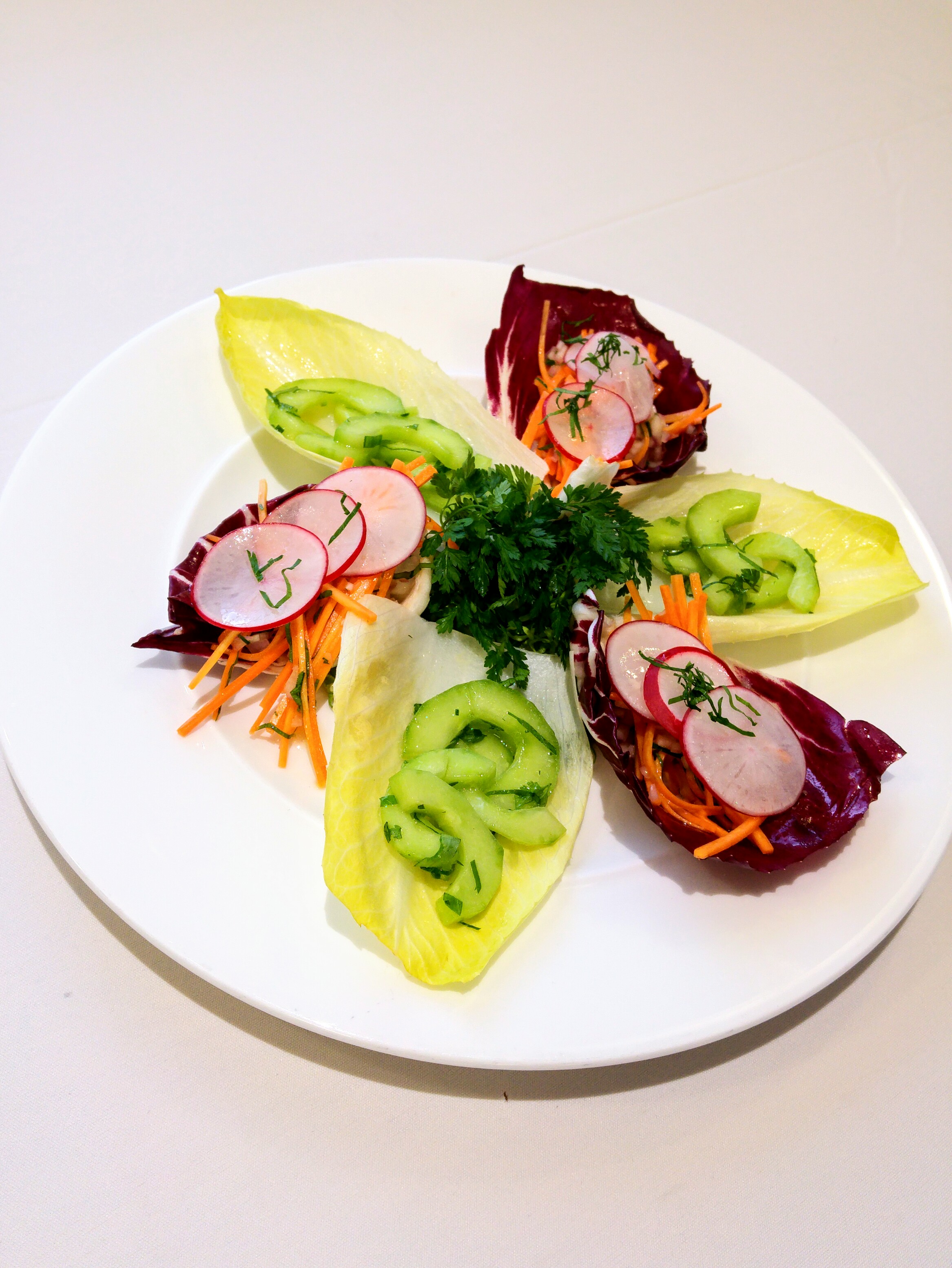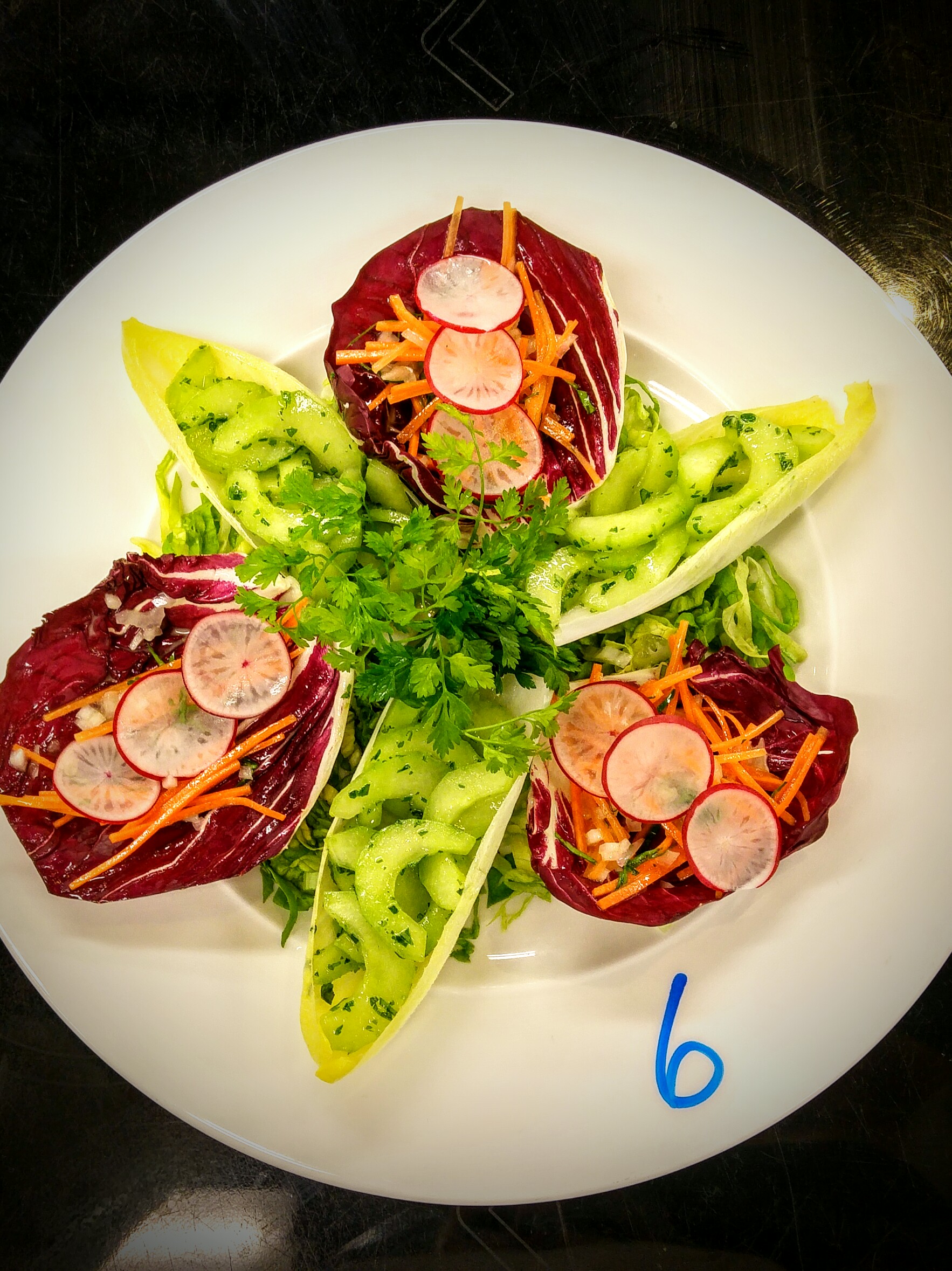 Další den byla cesta už v úplně jiném rozpoložení. Začínali jsme až v 11:30, tak jsem se mohla vyspat (to, že jsem se stejně vzbudila ve 4 nechme stranou) a rozhodla jsem se část cesty jít opět pěšky, jen jinou cestu, aby to bylo pestřejší. První na programu bylo demo s chefem Anthonym (onen sympatický Welšan, který nás provázel po škole) a hned po něm následovala praktická. Opět jsme se věnovali krájení zeleniny (julienne, emince, chifonade, ciseler, haché), ale tentokrát jsme si k tomu připravili i dresing (neboli nestabilní studenou emulzi, jak se píše v našich skriptech) a všechny prvky spojili do salátu. No už se pomalu někam dostáváme… 🙂 Feedback byl víceméně pozitivní, jen bych, jak sama dobře vím, měla zapracovat na práci s nožem a konzistentnosti ve velikosti krájené zeleniny.