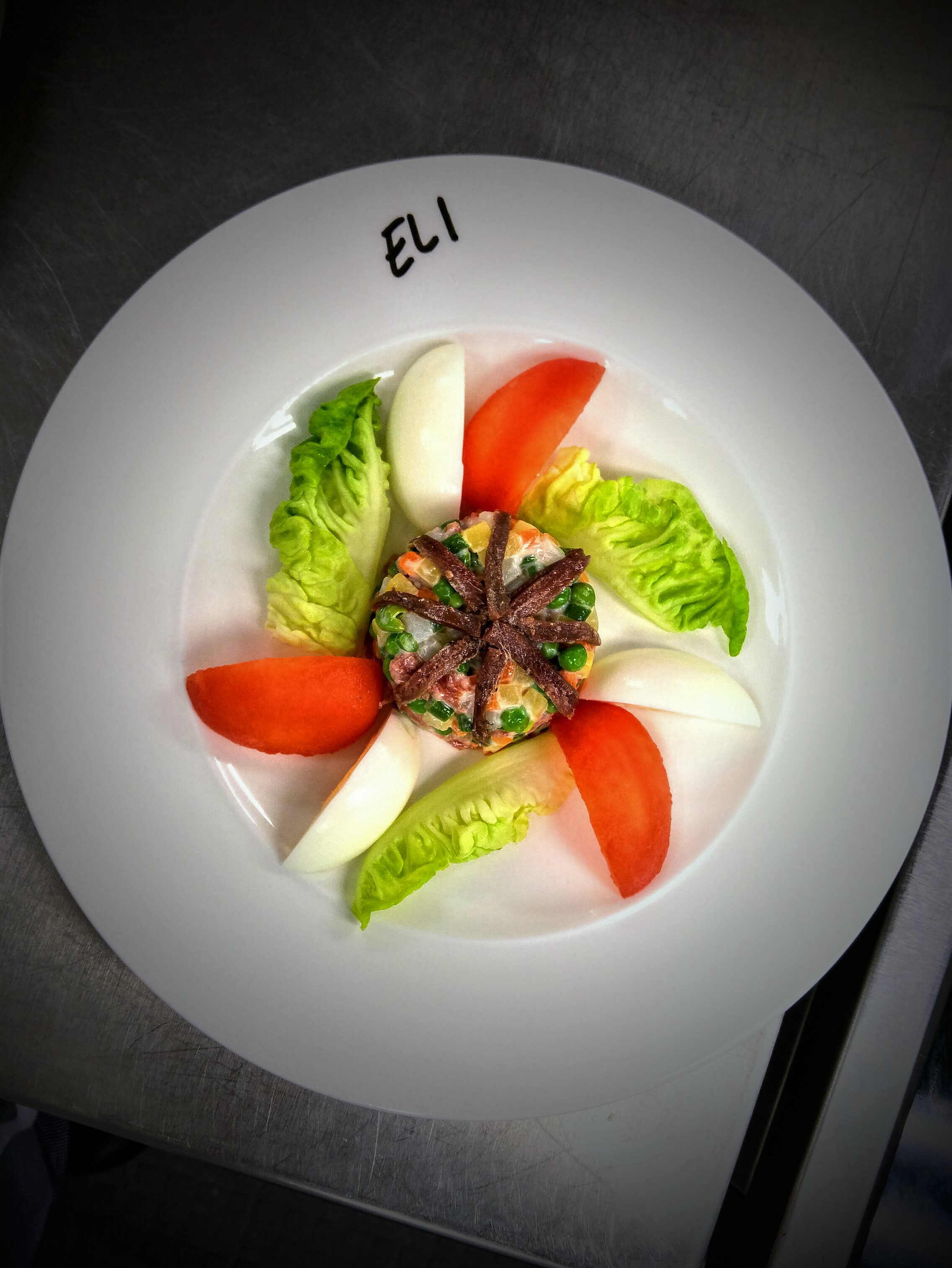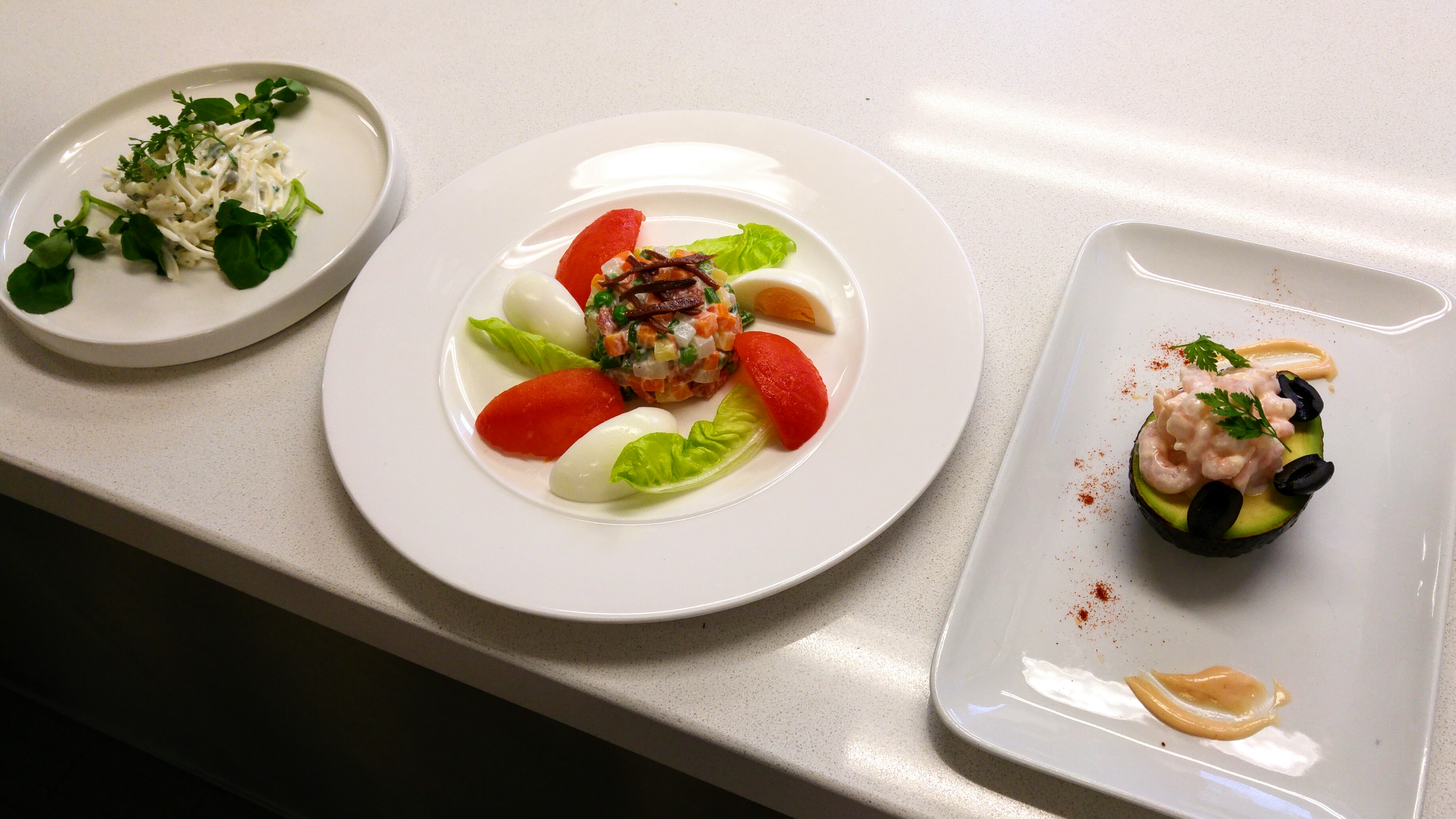 Ve středu jsme se v demu a následně praktické věnovali opět zelenině a studené stabilní emulzi (neboli majonéze 🙂 ). Chef připravoval tři saláty s dresingy na bázi majonézy, všechny docela retro, jak už se to u majonézových salátů dá očekávat. Italský salát s povařenou zeleninou nakrájenou na macedoine a následně spojenou majonézou, dále krevety v klasické koktejlové omáčce servírované na avokádu a taky celerovou remuládu. Což je hromada celeru nakrájená na julienne…Jak jen jsme si všichni oddechli, když jsme se dozvěděli, že remuládu v praktické dělat nebudeme. Připravovali jsme pouze italský salát, což mimojiné znamenalo, že poprvé zapneme sporáky. Krom toho opět trocha pravítkového krájení, loupání rajčat, vaření vajec, blanšírování zeleniny a ruční šlehání majonézy. Velmi postupně a nenápadně se nám začíná ukazovat, jak je při práci v kuchyni nutná promyšlená organizace a multitasking. Feedback byl docela dobrý, až na špatně naaranžované ančovičky (moje blbost, zde se hold rozmanitost neoceňuje…), ale co mě moc potěšilo, mé macedoine bylo „nice and consistent“. No hurá!