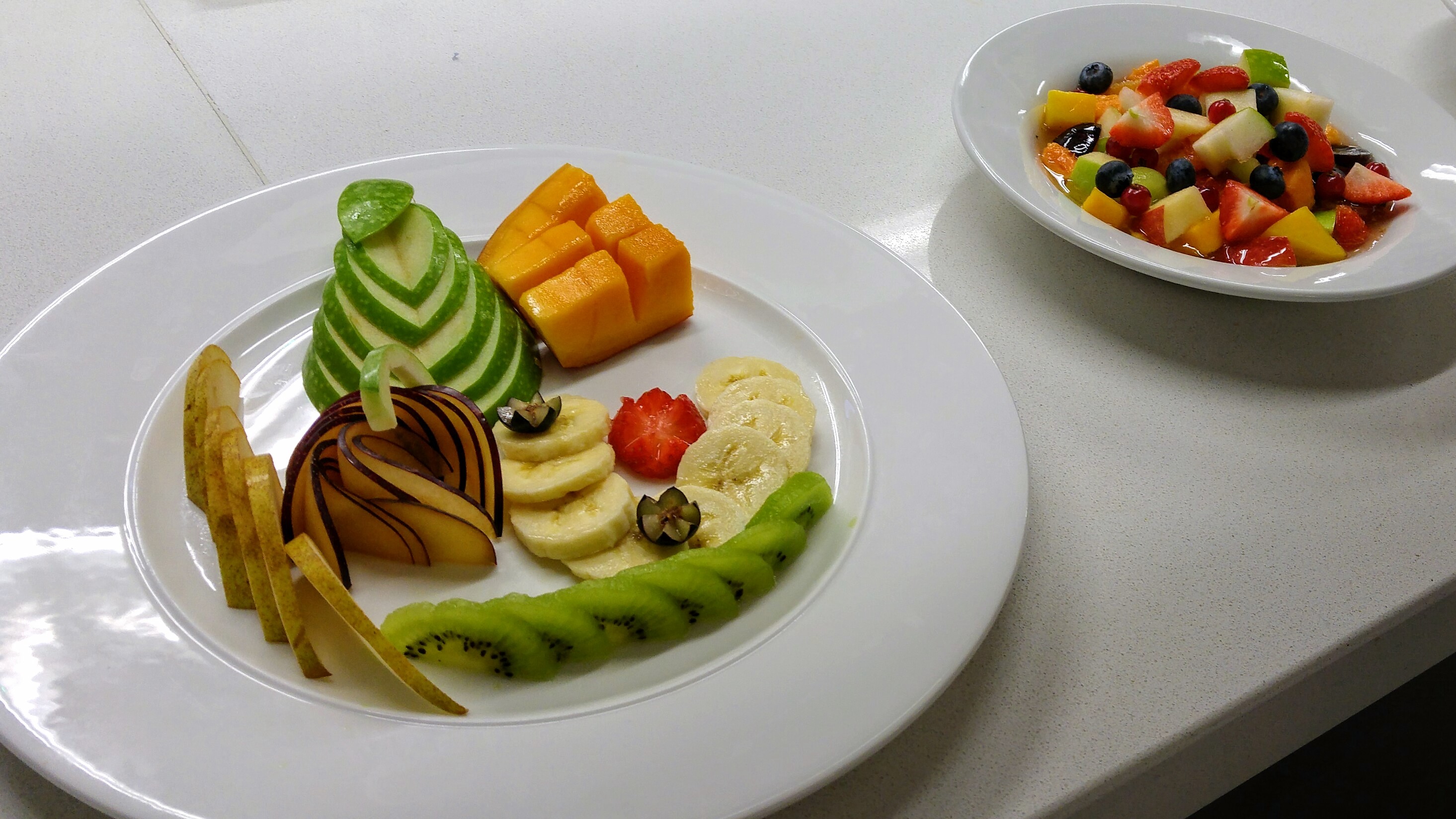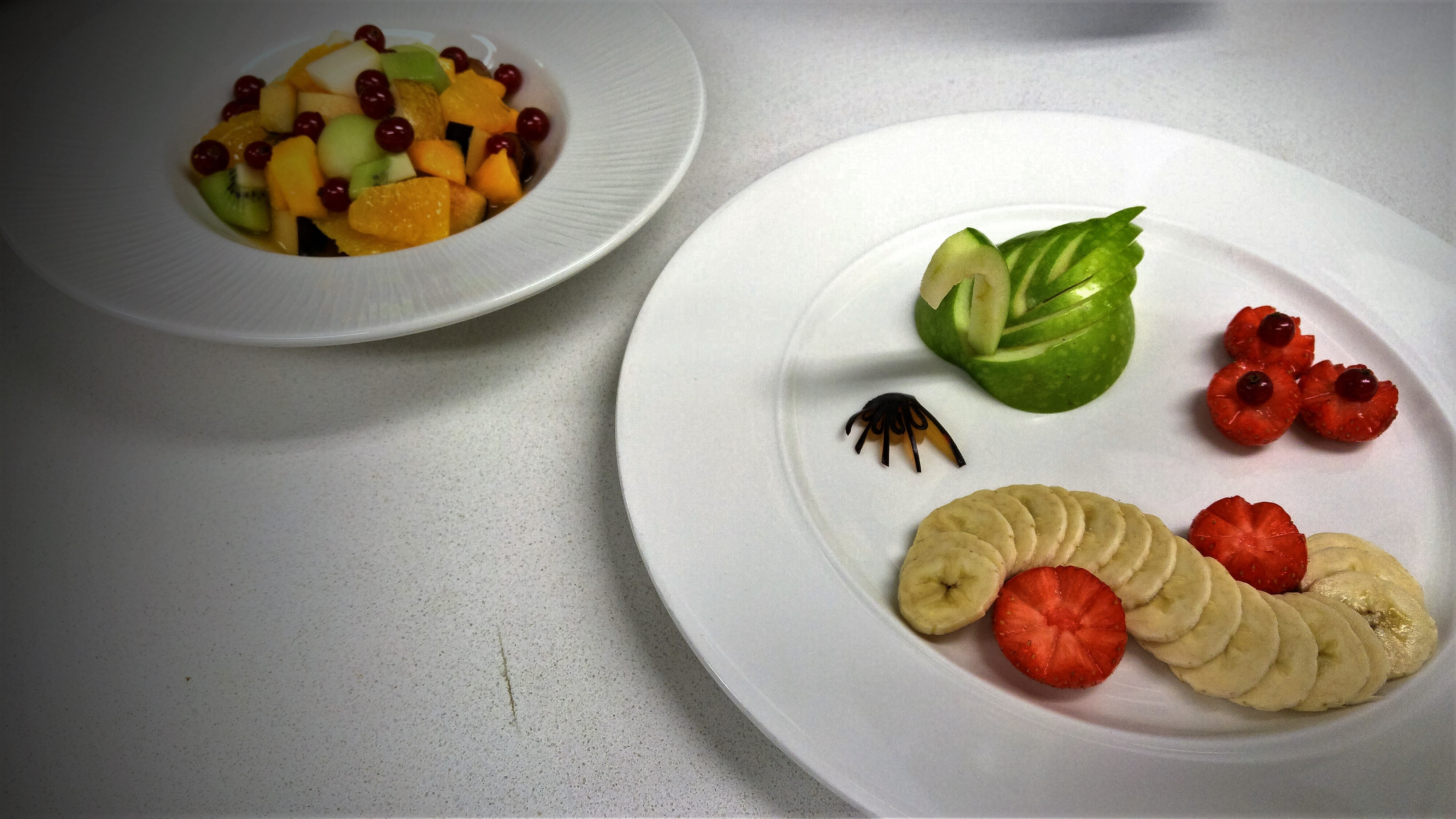 Krom salátu jsme měli připravit také talíř s různými dekoracemi z ovoce, což nikdo z nás příliš nestíhal, protože to, že máme připravit i dekorace jsme se dozvěděli až v polovině praktické. No a taky jsme si všichni asi až příliš dlouho hráli s cukrem… Feedback byl ale nakonec dobrý a i mé dekorace byli „really really good“. Ne že by mě to nepotěšilo, ale jsem si samozřejmě vědoma, že jsme na začátku kurzu a nikdo z chefů nikomu neřekne, že je něco co se týče dovedností špatně (ale to neznamená, že nezkritizují nepořádek, ndostatečnou hyginu či špatnou organizaci či zapojení do týmové práce). Ohledně krájení či jiných dovedností je to ale víceméně buď „good“ nebo „keep practicing“.