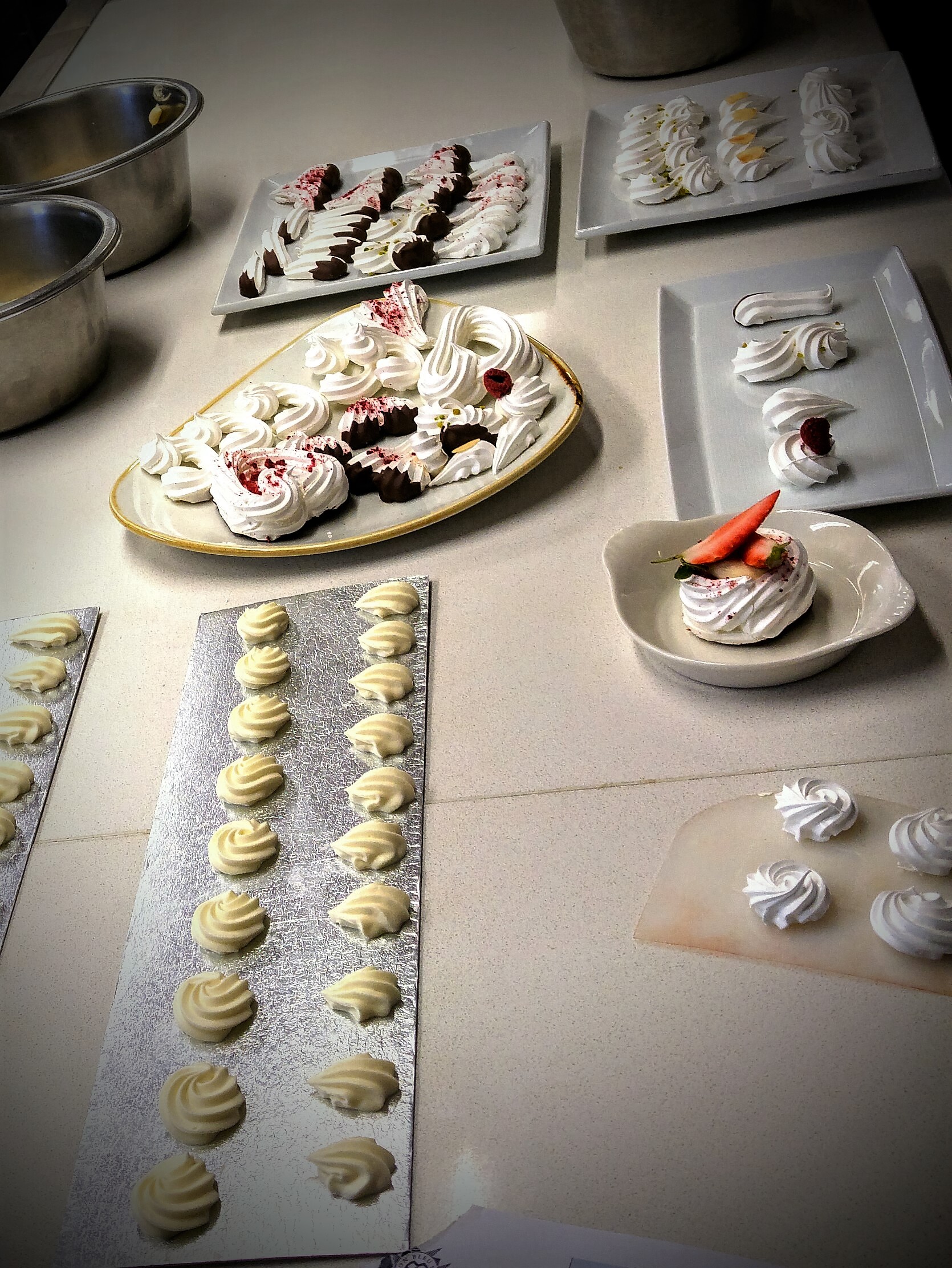 Pátek byl další dlouhý a náročný den. Mezi demem a praktickou jsme navíc absolvovali naši první technickou lekci, tentokrát zaměřenou na bezpečnost práce (popáleniny, řezné rány a tak). Jinak to byl den opět věnovaný cukrařině. Den začal demem na krémy a meringue. Jednalo se o základní cukrářský krém neboli creme patisserie, ze kterého chef připravoval creme chibouste (s italským sněhem), creme musseline (s máslem) a creme diplomat (se šlehačkou) a dále tři druhy sněhu neboli meringue, tedy francouzský (klasický sníh), švýcarský (připravovaný nad parou) a italský (s cukrovým rozvarem). Byla to hodina poměrně zmatená, chef pracoval možná až zbytečně rychle (skončili jsme o půl hodiny dřív) a moc se nepatlal s nějakým vysvětlovaním či názornými ukázkami. Praktické pak díky tomu bylo také trochu zmatené, protože si nikdo nebyl úplně jistý co a v jakém pořadí má připravovat. Pracovali jsme ve dvojicích a navzdory počátečnímu váhání jsme nakonec všechno zvládli. Začali jsme švýcarským sněhem. Mezitím druhý z dvojice navážil všechny suroviny na creme patisserie a jakmile byl sníh hotový, vykoušeli jsme si poprvé naše „piping skills“ a vytvořili všemožné „pusinky“. Sněhové cukroví putovalo do trouby a mohli jsme se pustit do creme patisserie. Šup do lednice a následoval creme chantily (fancy francouzská slova pro oslazenou, případně ochucenou šlehačku) a opět jsme si vyzkoušeli práci se zdobicím sáčkem. V tomto případě jsme měli nastříkat deset rozet a deset mušlí.