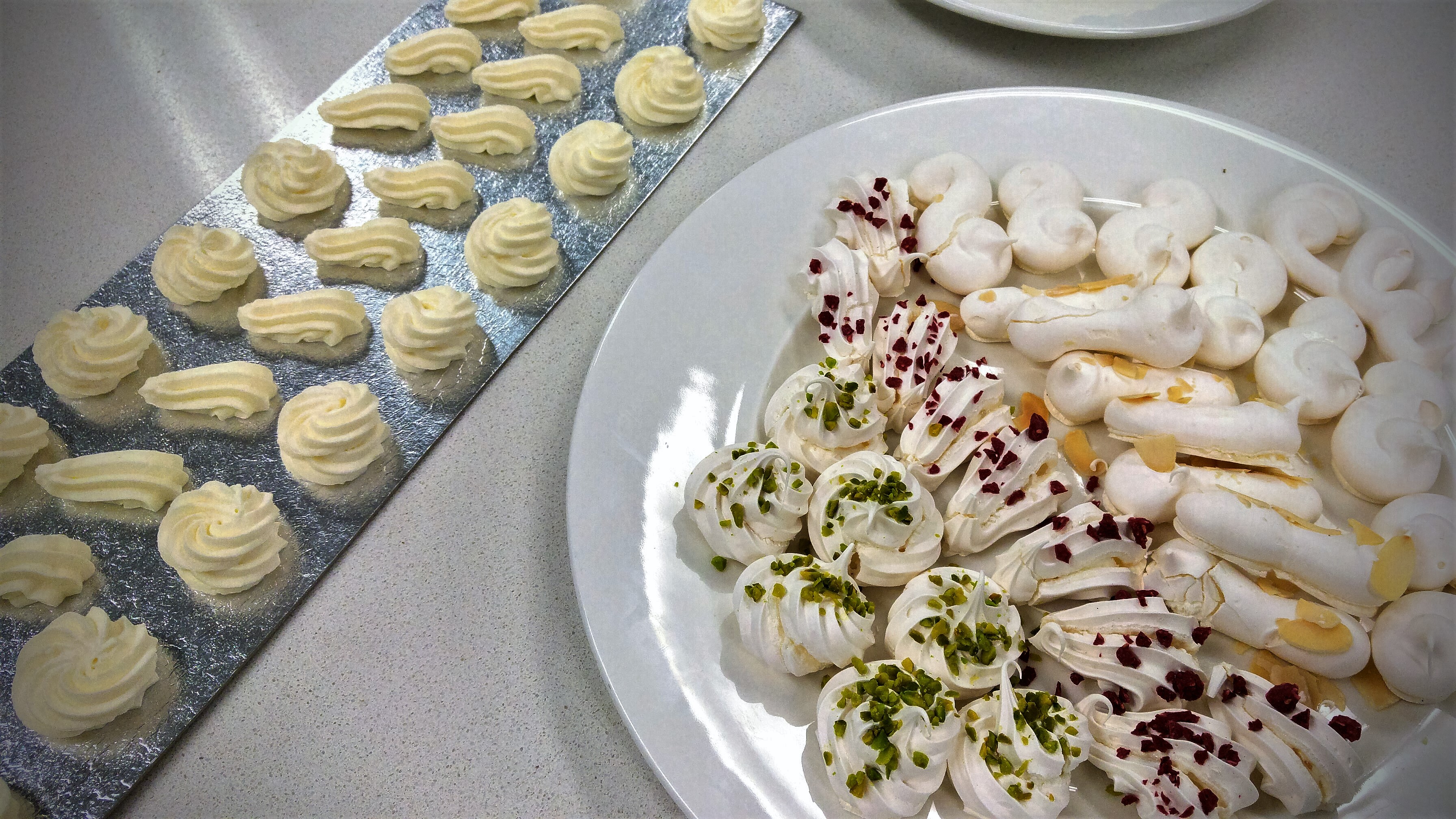 Jakmile jsme byli s naší prací spokojení, bylo na čase přetransformovat naše creme patisserie do dalších dvou krémů. Jeden z dvojice pracoval na creme diplomat a druhý na creme musseline. Pro feedback jsme měli prezentovat naše sněhové cukroví, nastříkaný creme chantily a hotové creme diplomat a creme musseline (zde šlo pouze o strukturu a chuť). Osobně mi více chutnal creme musseline, prostě proto, že „anything is better with butter“. Hodnocení bylo víceméně pozitivní, jen bych měla zapracovat na výšce svých rozet (moc vysoké) a mušlí (moc nízké).