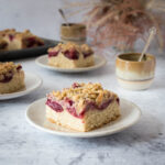 Těsto rozválejte do obdélníku. Plech klasické velikosti vyložte pečicím papírem nebo důkladně vymažte a vysypte moukou a přeneste na něj těsto. Prsty roztlačte do všech stran. Těsto poklaďte švestkami řezem nahoru (pokud chcete použít víc švestek, nakrájejte je na čtvrtiny) a posypte drobenkou. Přikryjte a nechte ještě zhruba půl hodiny až hodinu dokynout.