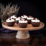 Profiterolky shora lehounce seřízněte a zespodu udělejte otvor. Profitorolky naplňte napůl třešňovým compote a doplňte tmavou šlehanou ganache. Trošku tmavé ganache dejte na podložky a profiterolky na ně přilepte (spodkem nahoru). Na profiterolky položte kolečka z temperované tmavé čokolády. Na kolečka nastříkejte bílou šlehanou ganache. Ozdobte hoblinkami tmavé čokolády a kostičkami třešňového želé.